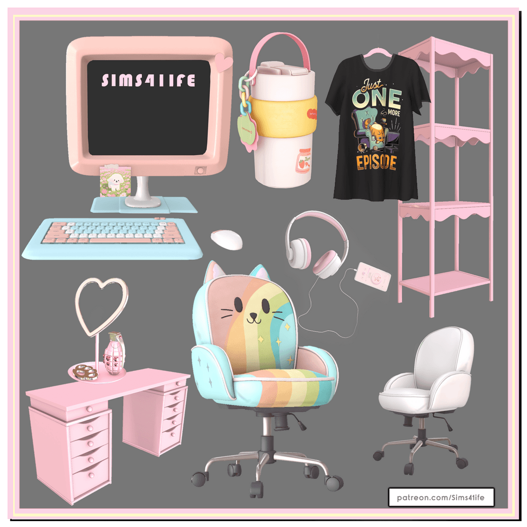 Emma setHi luvs, this is the new set of the month! A 9 items gamer set, includes a functional computer, hope you enjoy it! Also a deco t-shirt that you can hang from the many rocks I made, with a gamer and japan-ish style. Happy week!