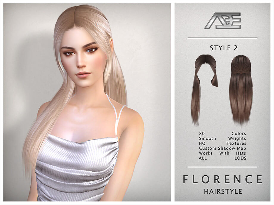 Florence – Style 2 (Hairstyle)New Hair Mesh 80 Colors HQ Textures No Morph Smooth Weight Works with hats All LODs Custom Ambient Occlusion or Shadow Map