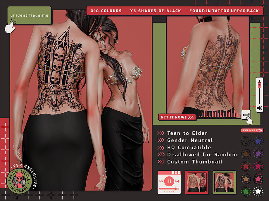 Lost V2 Tattoo 10 Colours 5 Shades of Black Found in Tattoo Upper Back Gender Neutral (Fits Female Best) Teen – Elder HQ Compatible Disallowed for Random Custom Thumbnail Works for both Alpha and MM Skins Base Game Only